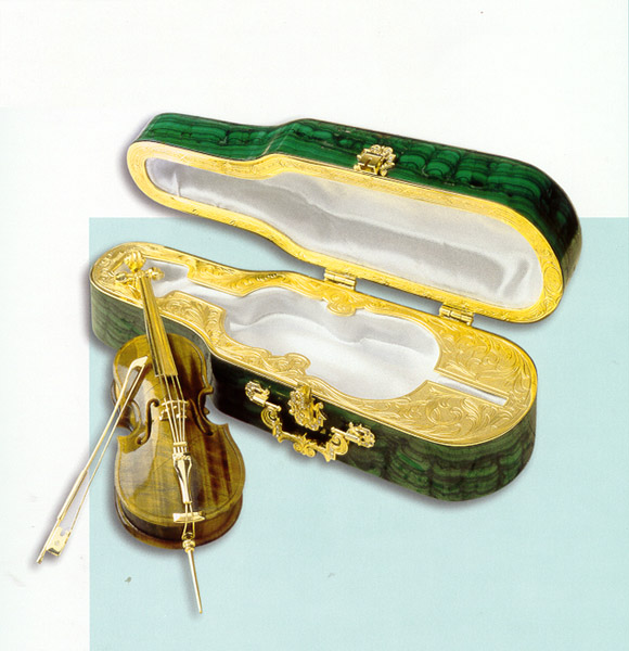 | | | Souvenir "Violoncello". Gold, tiger eye, brilliants, malachite, white satin. | |