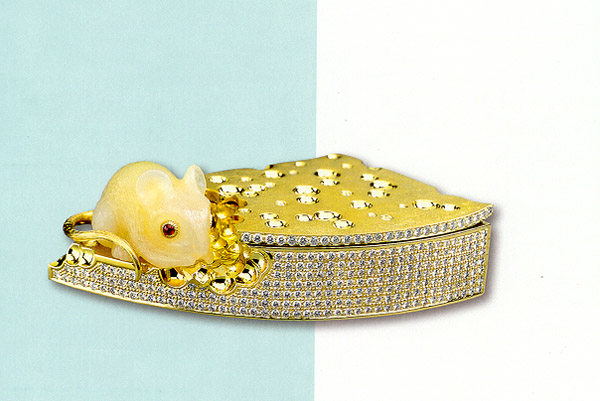 | | | Casket "Mouse on piece of chese". Gold, brilliants, chalcedony. | |