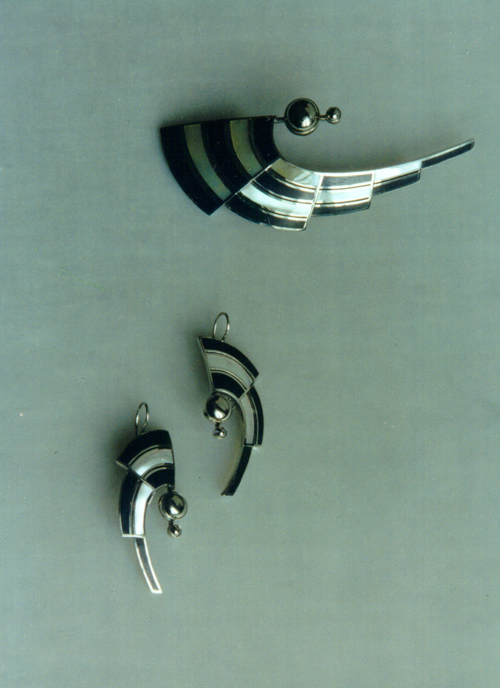 | | | Suit "Accord" . 1989. German silver, black wood, mother-of-pearl, pyrites. | |