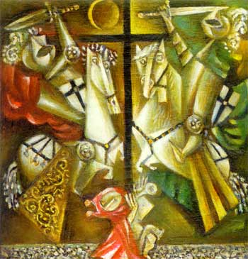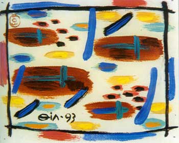 One December night in 1993, after lots of conversations had been held, he came to us, by bike as usual, with a sack behind his back, his moustaches and beard covered with frost like those of Santa Claus Then he opened the sack and put out three nice. pictures as big as 13x27 sm , and a dozen of stretched canvases of the same size The same night, unable to bear the view of an empty canvas, Misha Brusilovsky began to paint a small picture. The next day Svetlana Tarasova called in The foundation was laid