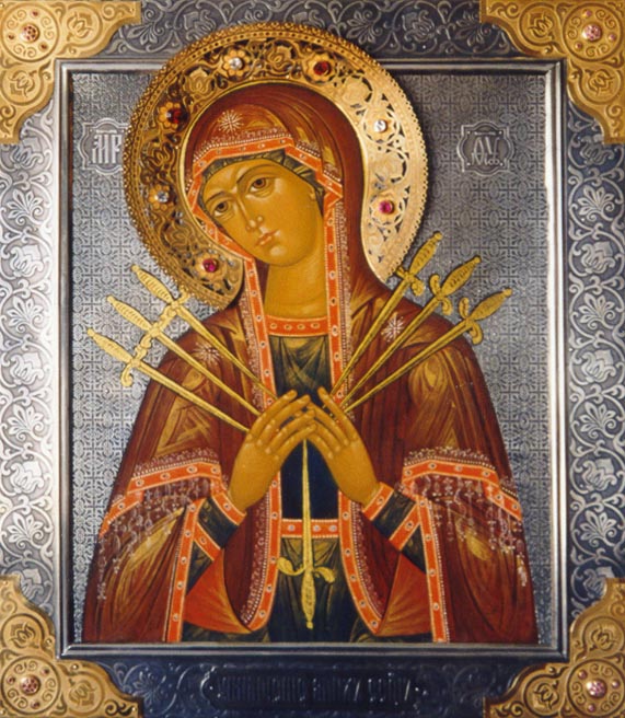 | | | Icon of the Virgin "Semistrelnaya" (" Of Seven Arrows" ) Icon. Wood, levkas, egg tempera, framework with guilting and silvering. The St. Nicolas church (Zarechny) | |