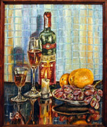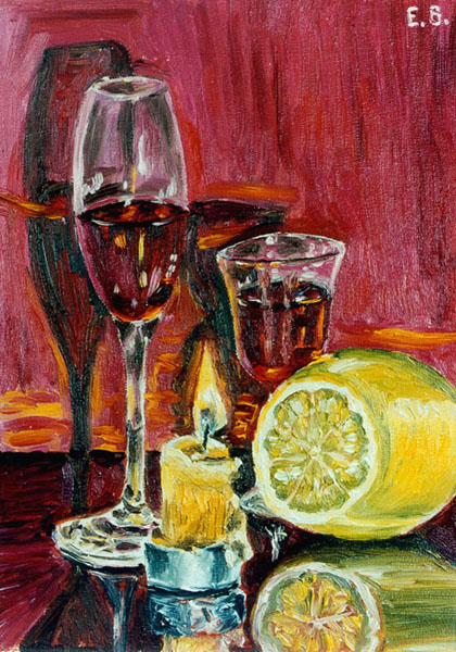 | | | "Pink Still-life with Glasses" 2000, cardboard, oil, 25x35 | |